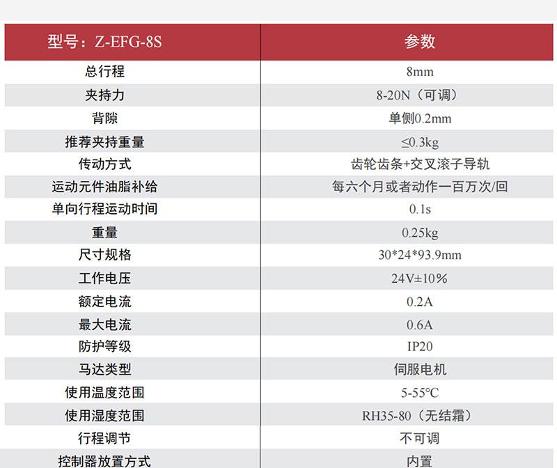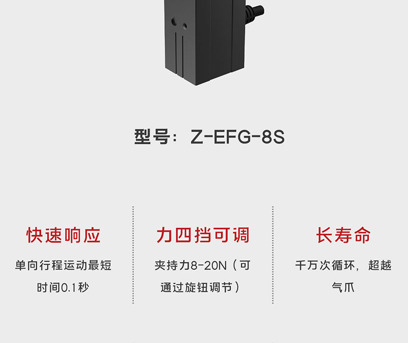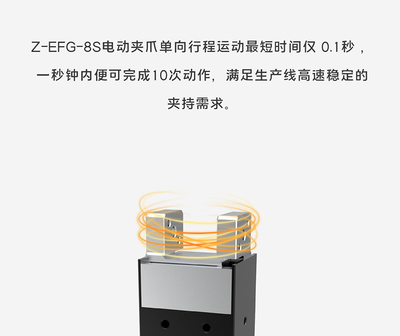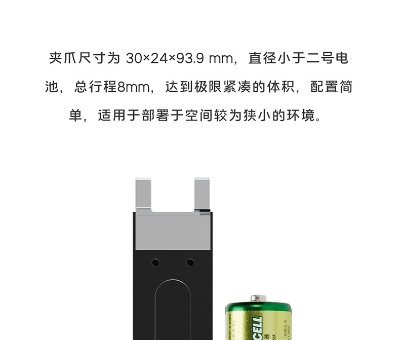 慧靈電動夾爪Z-EFG-8S,小體積結構緊湊,直徑小于二號電池,總行程8mm,達到極限緊湊的體積,配置簡單,適用于部署于空間較為狹小的環(huán)境,夾爪的單向行程最短時間為0.1秒,一秒鐘可以完成十次夾持動作,滿足生產線高速穩(wěn)定的夾持需求。