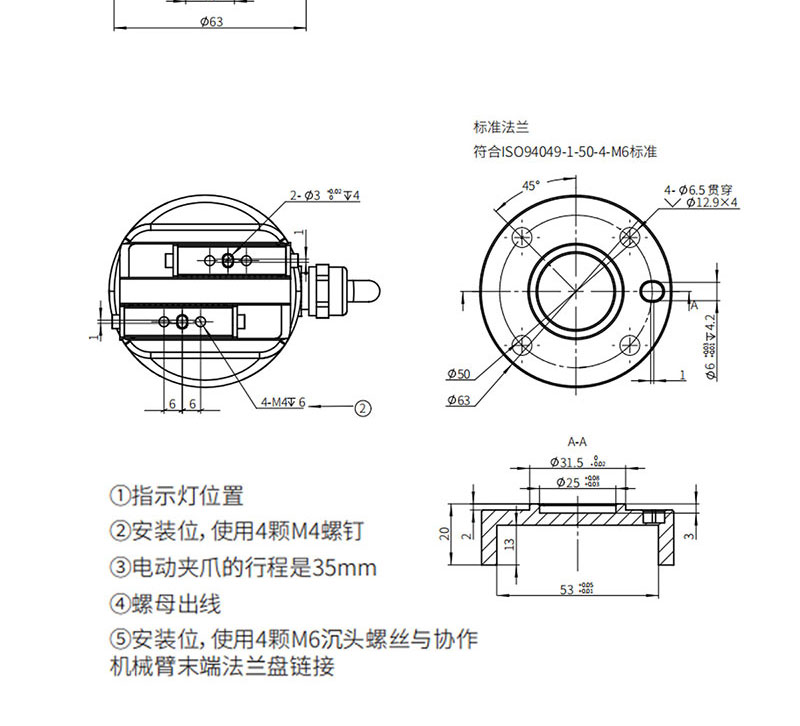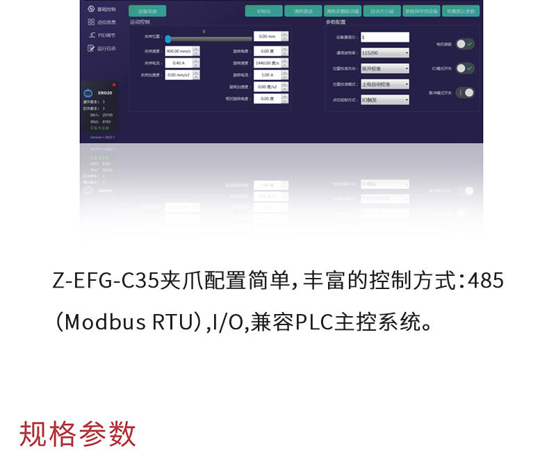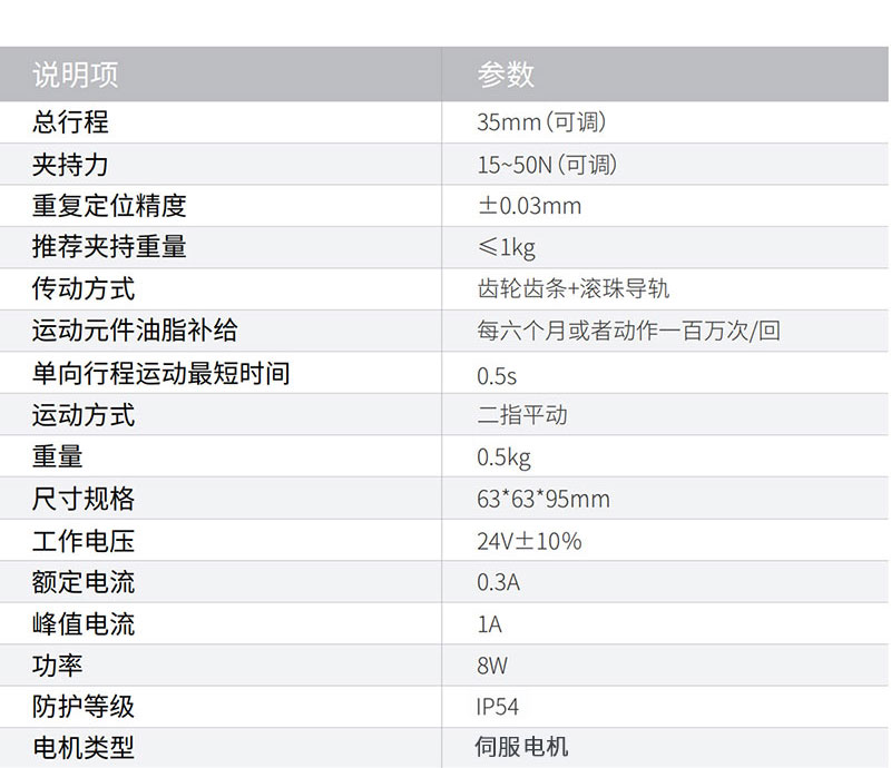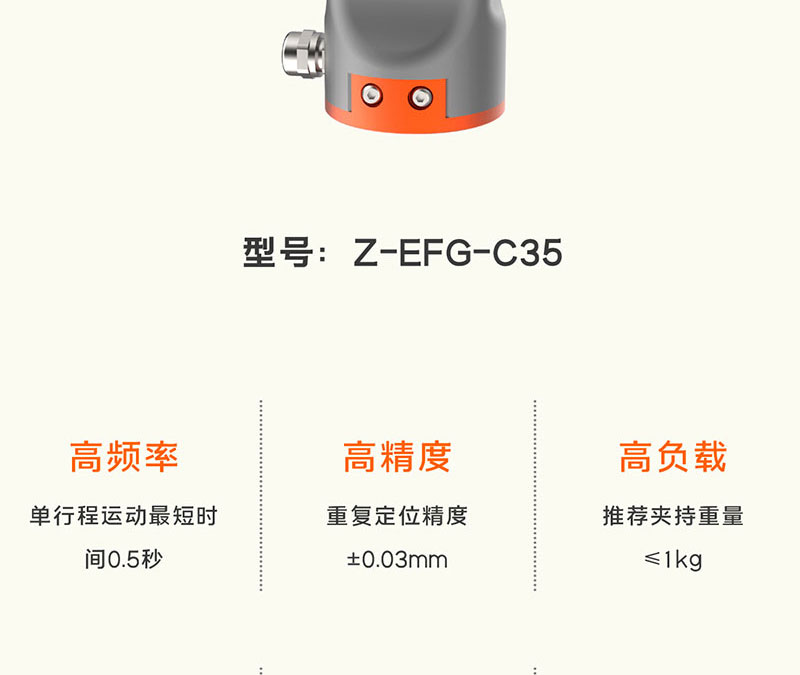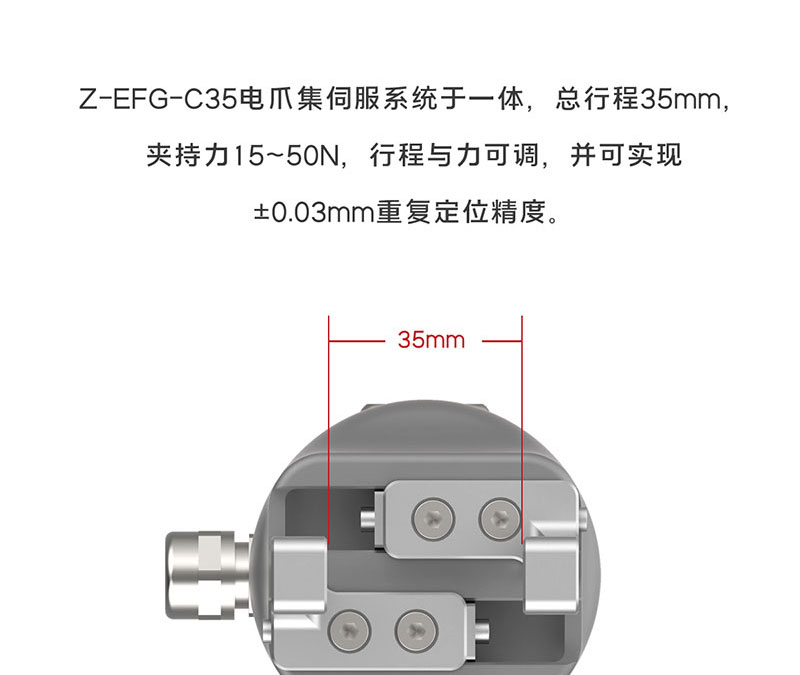 慧靈電動夾爪Z-EFG-C35,行程35mm,夾持力50N,兼容六軸協作機械臂,是一款集伺服系統于一體,即插即用的六軸機械臂電爪,單向運動最短時間為0.5s,可以滿足產線高速穩定的夾持需求!
