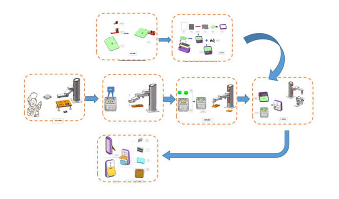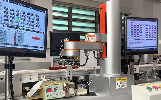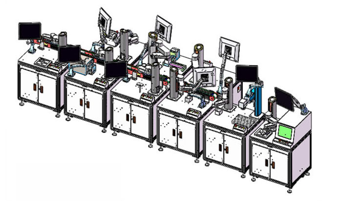 可單機控制操作,也可整線聯(lián)合使用;系統(tǒng)從溫度計原料上料開始,進行點膠、磁鐵組裝、焊錫、鎖螺絲、搬運、組裝壓合、激光打標,最后下料產(chǎn)出一個完整定制化產(chǎn)品。