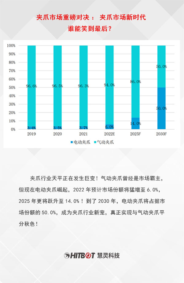 夾爪行業(yè)天平正在發(fā)生巨變!氣動夾爪曾經(jīng)是市場霸主,但現(xiàn)在電動夾爪崛起,2022年預計市場份額將猛增至6.0%,2025年更將躍升至14.0%!到了2030年,電動夾爪將占據(jù)市場份額的50.0%,成為夾爪行業(yè)新寵,真正實現(xiàn)與氣動夾爪平分秋色!