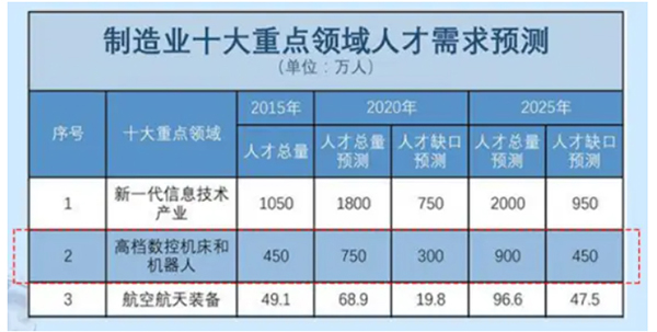 根據國家多部門聯合發布的未來制造業重點領域人才需求預測可看出。在2025年,機器人相關人才缺口將達450萬!這意味著5年將要增加450萬工業機器人從業人員!