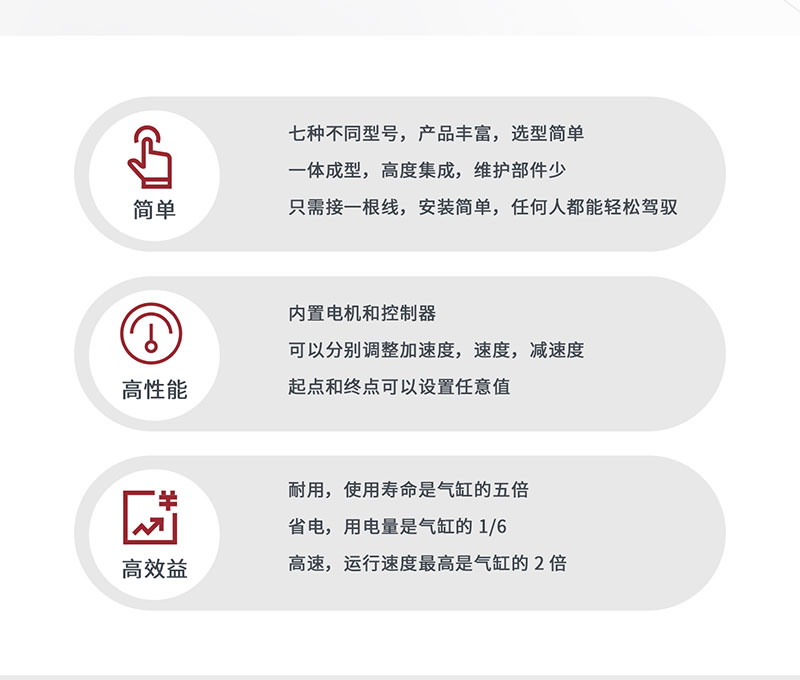 實現多種電缸、滑臺、推桿產品相互組合,快速拼接;擁有易于使用的編程軟件,即使無編程經驗,也能快速進行操作;