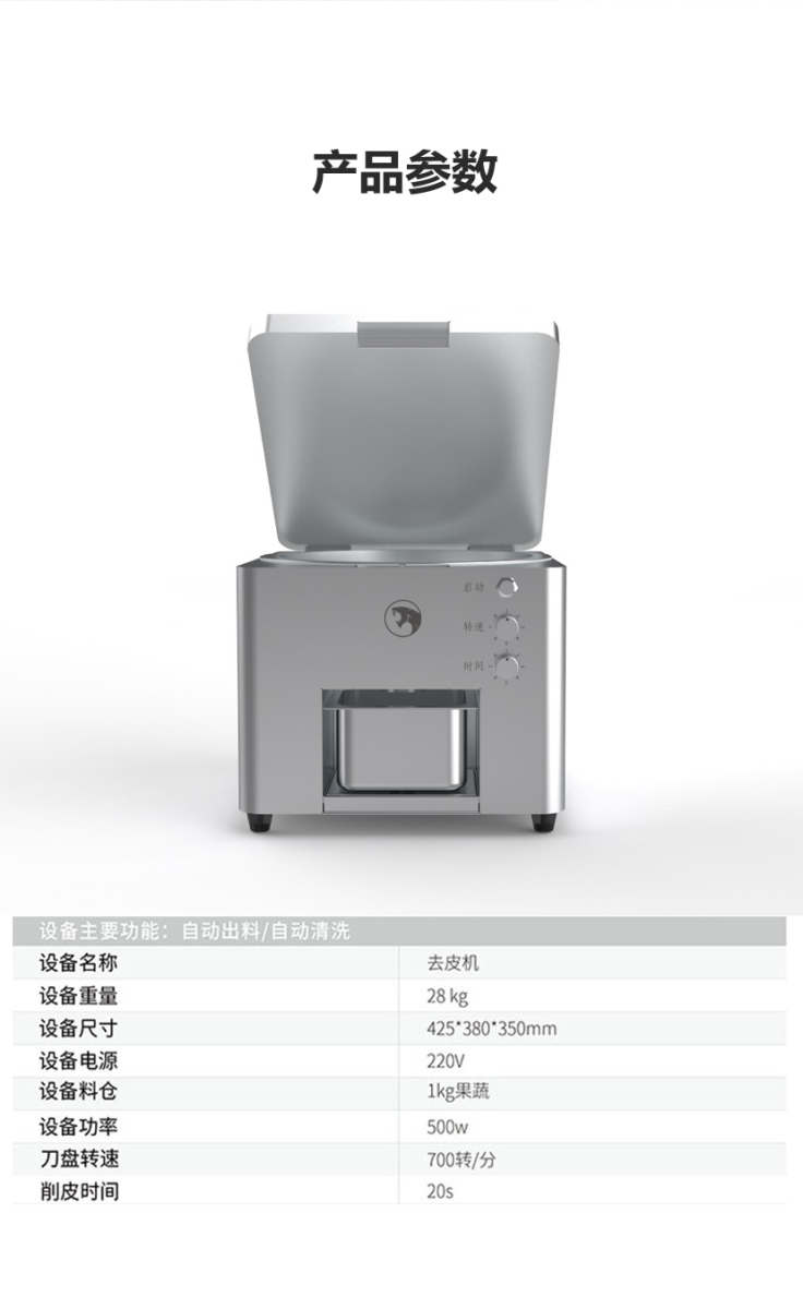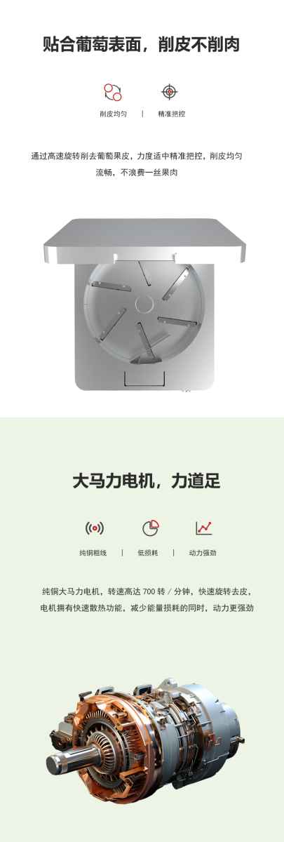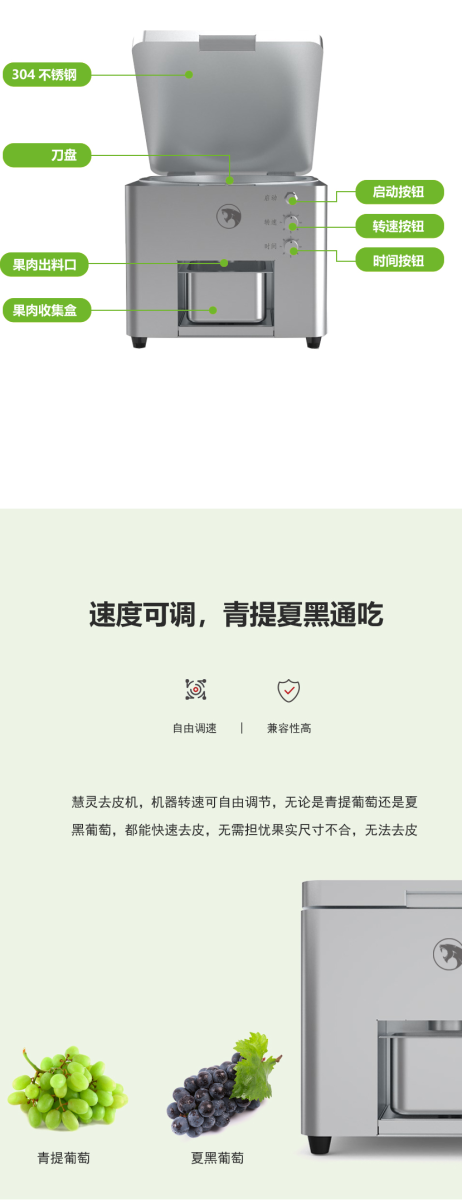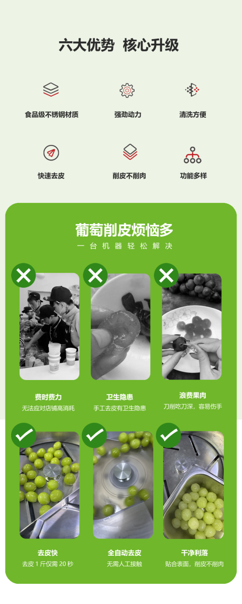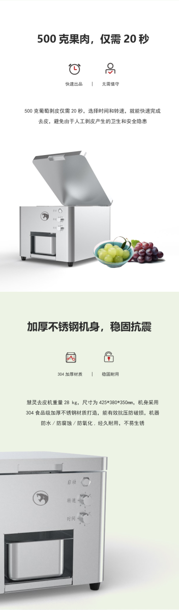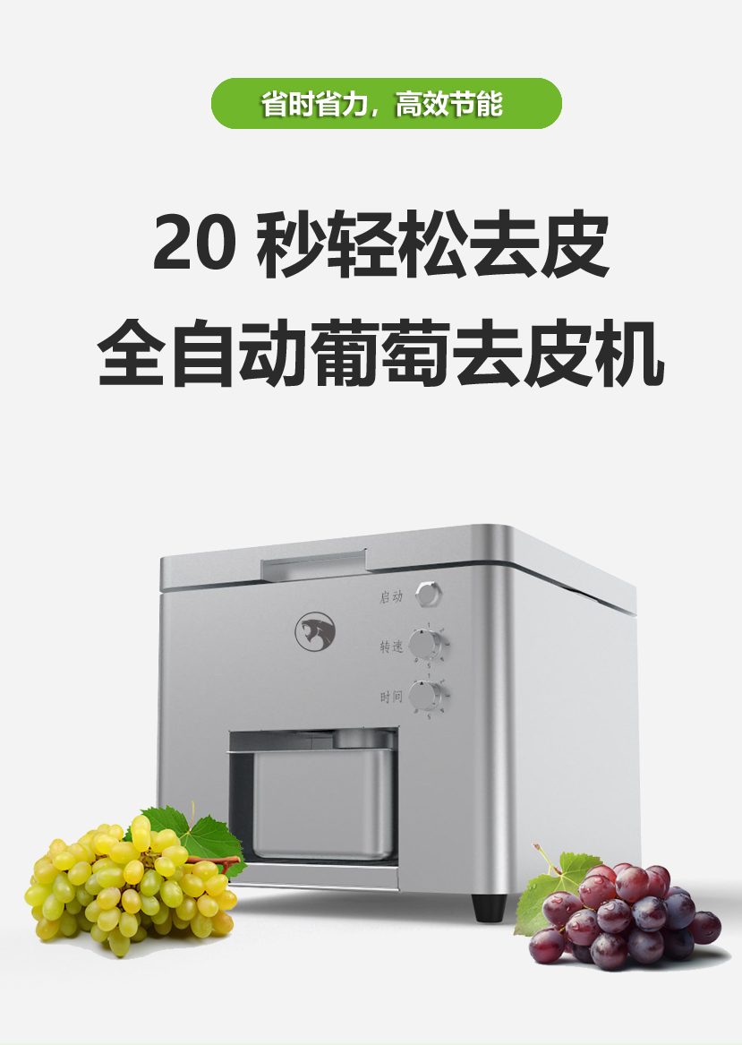 - 該葡萄剝皮機可對物料去皮以高度還原人工剝皮的效果,不僅提高了物料的去皮效率還能保證去皮過程更加衛生;