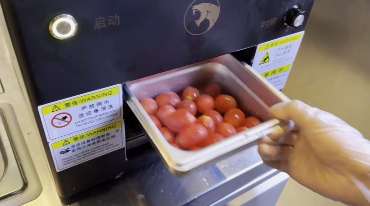使用慧靈HITBOT去皮機,您只需將圣女果放入機器,設定好時間和轉速,20秒后就能得到一碗光滑誘人的剝皮圣女果。而且,在整個去皮過程中,您無需時刻盯著機器,不僅提高了效率,還避免了因人工剝皮產生的衛生和安全隱患。