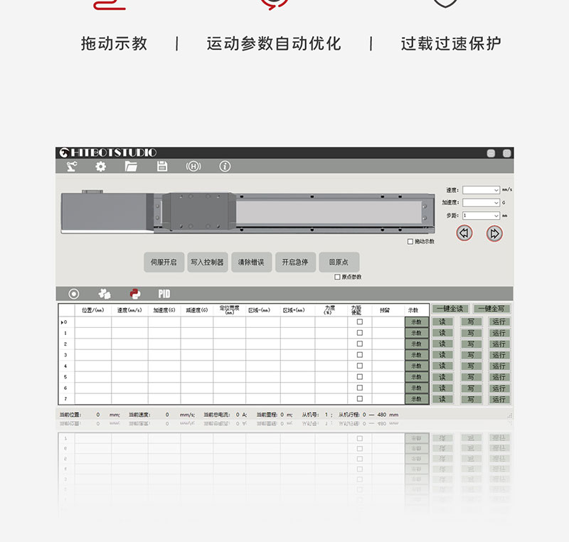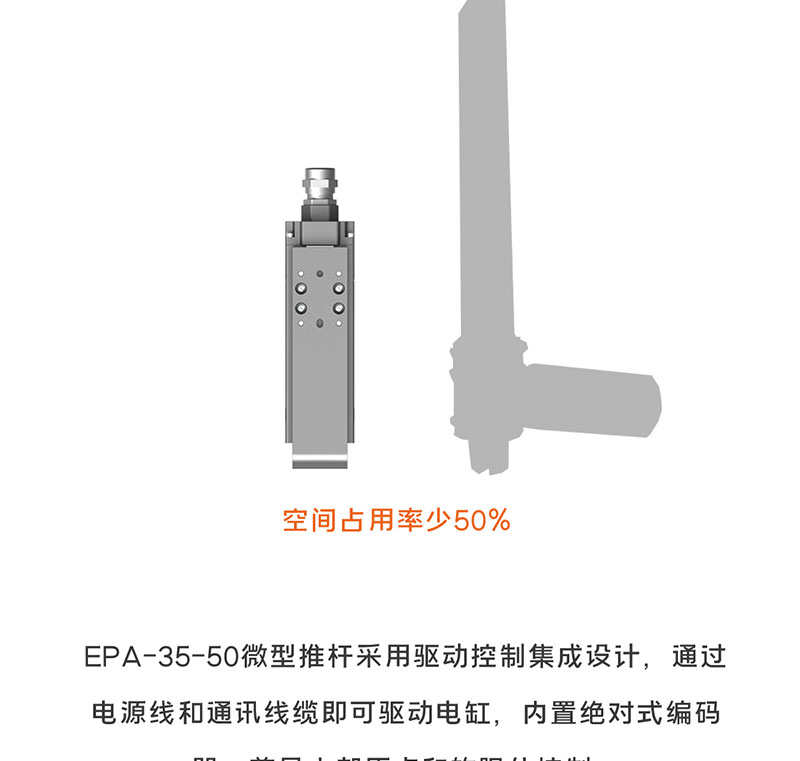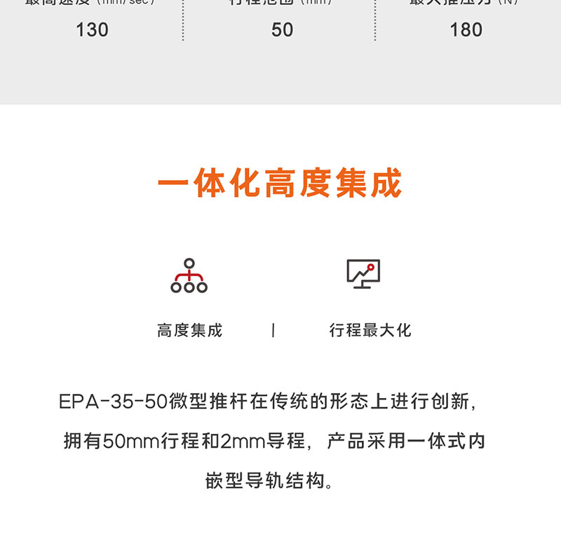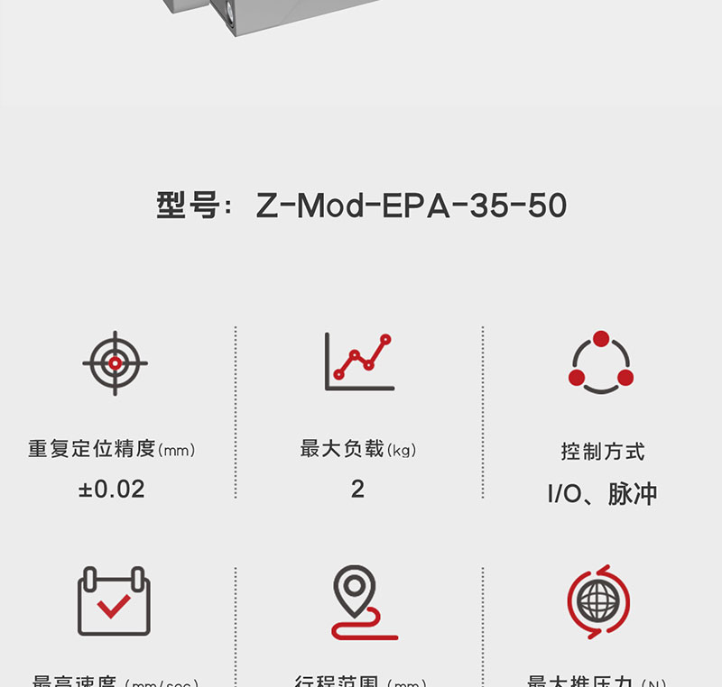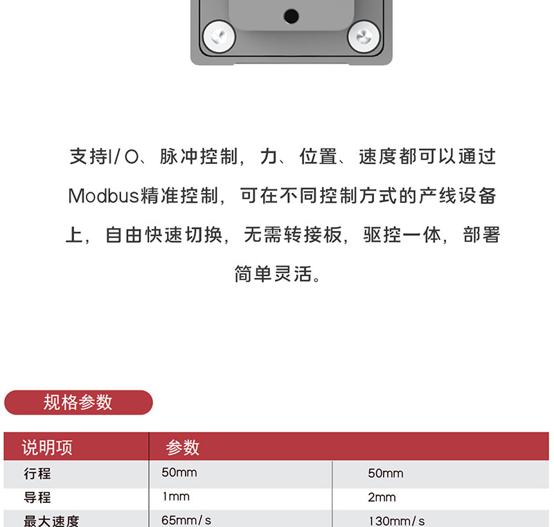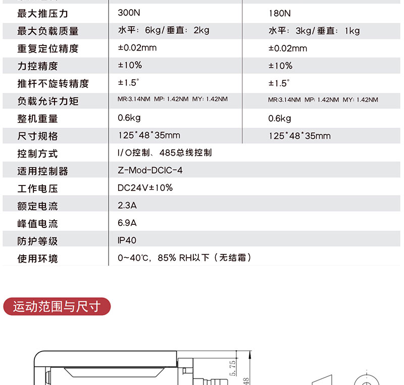 2023年1月7日 Lu, DongWu 智能電缸 0 Z-Mod-EPA-35-50 首頁(yè) / 智能電缸 / Z-Mod-EPA-35-50 微型電動(dòng)推桿 滑塊結(jié)構(gòu),抗傾覆力強(qiáng) 點(diǎn)擊觀看視頻 微型電動(dòng)推桿 滑塊結(jié)構(gòu),抗傾覆力強(qiáng) 點(diǎn)擊觀看視頻 產(chǎn)品描述 型號(hào)參數(shù) 資料下載 產(chǎn)品描述 Z-Mod-EPA-35-50 核心參數(shù) 2mm 300N? 導(dǎo)程 最大推壓力 50mm ? ? ? ? ? ? ? ? ?3KG 行程 ? ? ? ? ? ? ? ? ? ? ? ? ? ? ? 重復(fù)定位精度 *線框尺寸圖 型號(hào)參數(shù) 說(shuō)明項(xiàng) 參數(shù) 行程(mm) 50mm 50mm 導(dǎo)程(mm) 1mm 2mm 最大速度(mm/s) 65mm/s 130mm/s 最大推壓力(N) 300N 180N 最大負(fù)載質(zhì)量(kg) 水平:6kg/垂直:2kg 水平:3kg/垂直1kg 重復(fù)定位精度(mm) ±0.02mm ±0.02mm 力控精度 ±10% ±10% 推桿不旋轉(zhuǎn)精度 ±1.5° ±1.5° 負(fù)載允許力矩 MR:3.14NM MP:1.42NM MY:1.42NM MR:3.14NM MP:1.42NM MY:1.42NM 整機(jī)重量 0.6kg 0.6kg 尺寸規(guī)格 125*48*35mm 125*48*35mm 控制方式 I/O控制、485總線控制 適用控制器 Z-Mod-DCIC-4 工作電壓 DC24V±10% 額定電流 2.3A 峰值電流 6.9A 使用環(huán)境 IP40 防護(hù)等級(jí) 0-40℃,85%RH以下(無(wú)結(jié)霜) 資料下載 點(diǎn)擊下載產(chǎn)品手冊(cè) 點(diǎn)擊下載3D圖 點(diǎn)擊下載運(yùn)動(dòng)范圍圖 產(chǎn)品詳情 相關(guān)產(chǎn)品