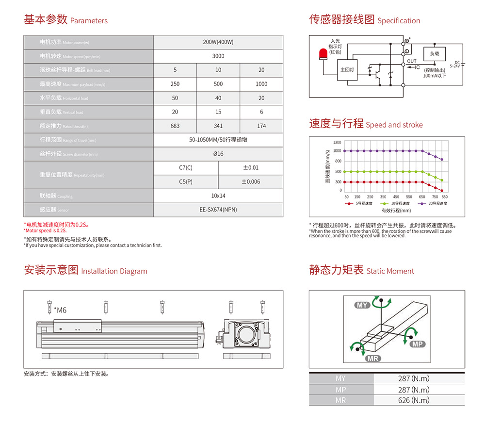 2023年5月23日 Lu, DongWu 智能電缸 0 Z-Mod-HSK8 首頁 / 智能電缸 / Z-Mod-HSK8 電機功率:200W(400W)絲桿外徑:16mm電機轉速:3000(rpm/min)重復定位精度:±0.006mm行程范圍:50-1050mm(50mm行程遞增)? 下載3D模型 下載產品手冊 電機功率:200W(400W)絲桿外徑:16mm電機轉速:3000(rpm/min)重復定位精度:±0.006mm行程范圍:50-1050mm(50mm行程遞增)? 下載3D模型 下載產品手冊 產品描述 資料下載 產品描述 Z-Mod-HSK8 核心參數 200W(400W) ?3000RPM 電機功率 ? 電機轉速 16mm ? ? ? ? ? ? ? ? ? ?50~1050mm ?絲杠外徑 ? ? ? ? ? ? ? ? ? ? ? ? ? ? ? ? ?行程范圍 *線框尺寸圖 規格參數 型號性能 電機功率 Motor power(w) 200W(400W) 電機轉速 Motor speed(rpm/min) 3000 滾珠絲桿導程-螺距 Belt lead(mm) 5 10 20 最高速度 Maximum payload(mm/s) 250 500 1000 水平負載 Horizontal load 50 40 20 垂直負載 Vertical load 20 15 6 額定推力 Rated thrust(n) 683 341 174 行程范圍 Range of travel(mm) 50-1050MM/50行程遞增 絲桿外徑 Screw diameter(mm) ?16 重復位置精度 Repeatability(mm) C7(C) ±0.01 C5(P) ±0.006 聯軸器 Coupling 10×14 感應器 Sensor EE-SX674(NPN) 資料下載 點擊下載產品手冊 點擊下載3D圖 點擊下載運動范圍圖 Z-Mod-HSK8 核心參數 規格參數 型號性能 電機功率 Motor power(w) 200W(400W) 電機轉速 Motor speed(rpm/min) 3000 滾珠絲桿導程-螺距 Belt lead(mm) 5 10 20 最高速度 Maximum payload(mm/s) 250 500 1000 水平負載 Horizontal load 50 40 20 垂直負載 Vertical load 20 15 6 額定推力 Rated thrust(n) 683 341 174 行程范圍 Range of travel(mm) 50-1050MM/50行程遞增 絲桿外徑 Screw diameter(mm) ?16 重復位置精度 Repeatability(mm) C7(C) ±0.01 C5(P) ±0.006 聯軸器 Coupling 10×14 感應器 Sensor EE-SX674(NPN) 產品詳情 相關產品